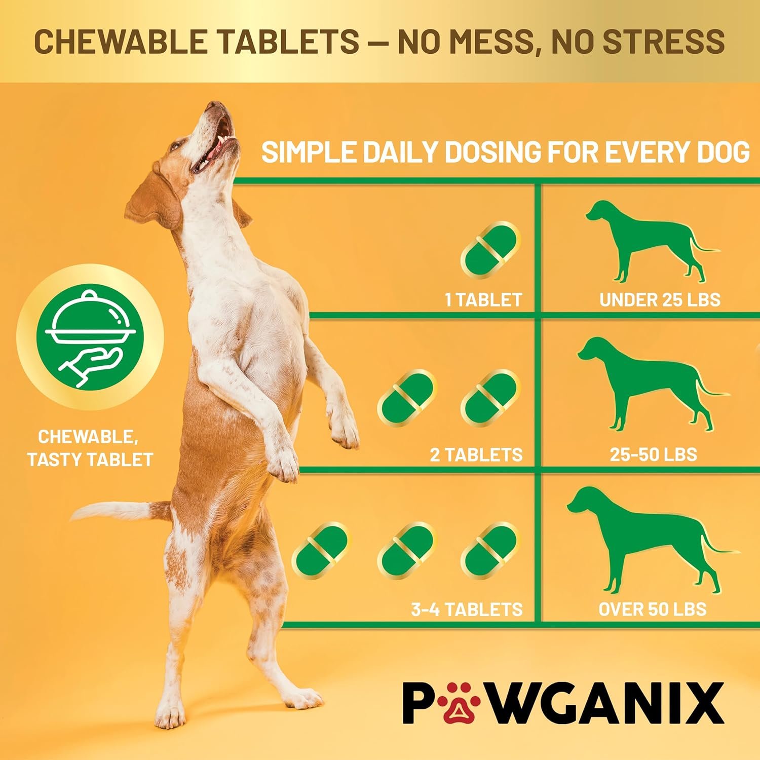 - Tasty chewable tablets. Delicious chewable tablets dogs enjoy — no messy powders or hard-to-swallow pills. Just 1 to 4 chews daily, based on your dog’s size. Great for small, medium, and large breeds alike.